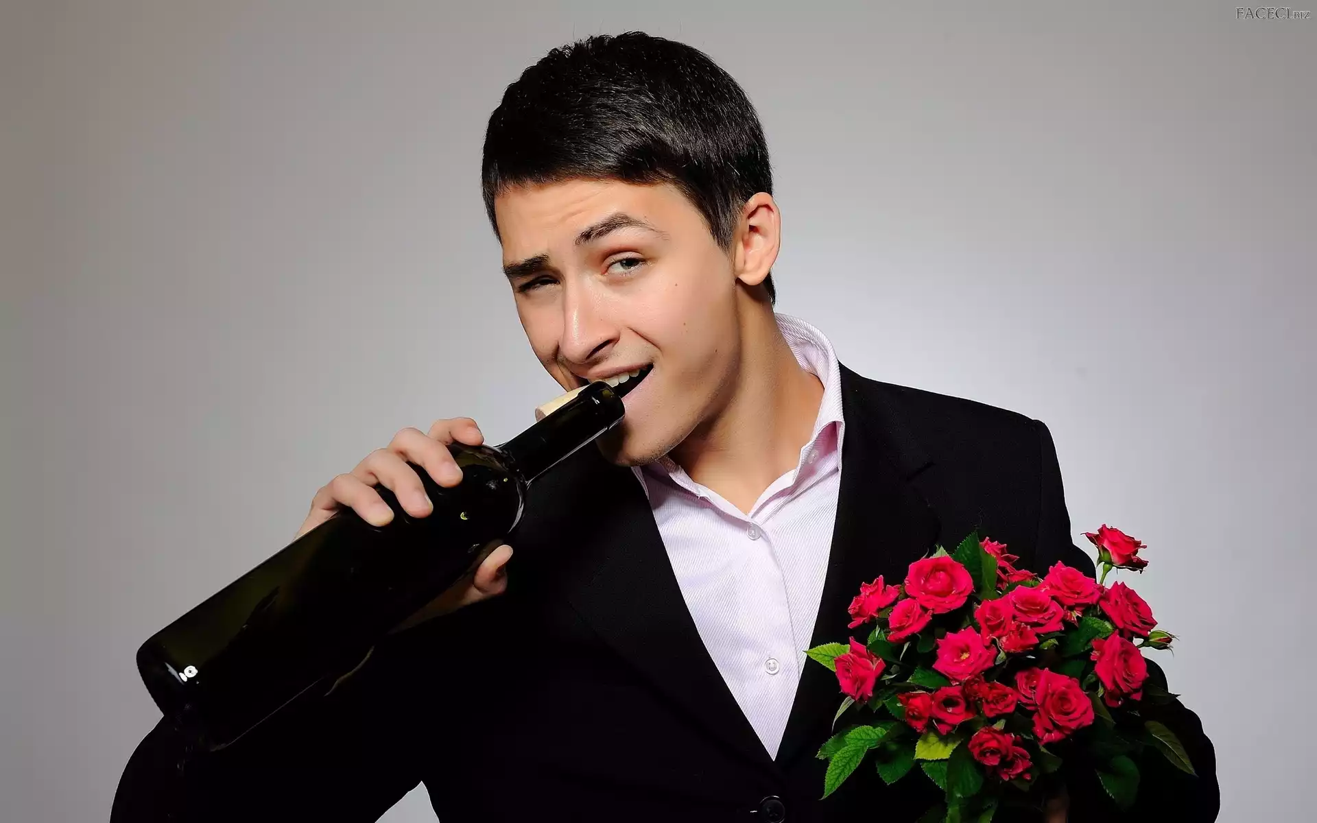 Róż, Bukiet, Uśmiech, Mężczyzna, Butelka - faceci.biz